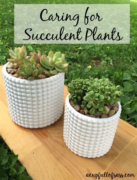 Nov 07, 2020 · We'll start with the most important parts of taking care of a succulent: watering and sunlight exposure. Watering a succulent. Back to top. If there is one thing that is the most important part of taking care of a succulent, then it's watering them. Succulents …Dec 10, 2021 · The best approach to watering succulents growing indoors is to set up a wet-dry cycle. When you water, water plants thoroughly making sure the entire soil volume is fully wetted and water runs out of the drainage holes in the container. Then allow plants …
